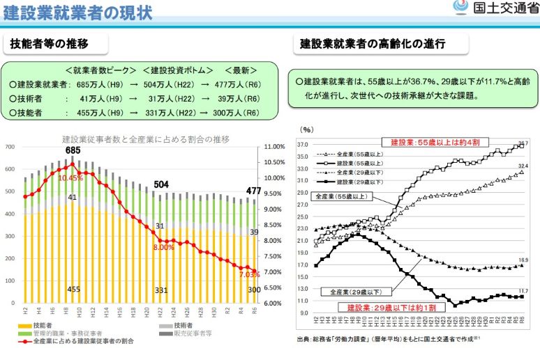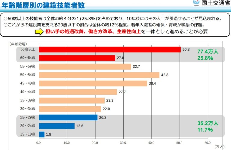 建設業界では職人の高齢化が進んでおり、若い世代が不足しています。