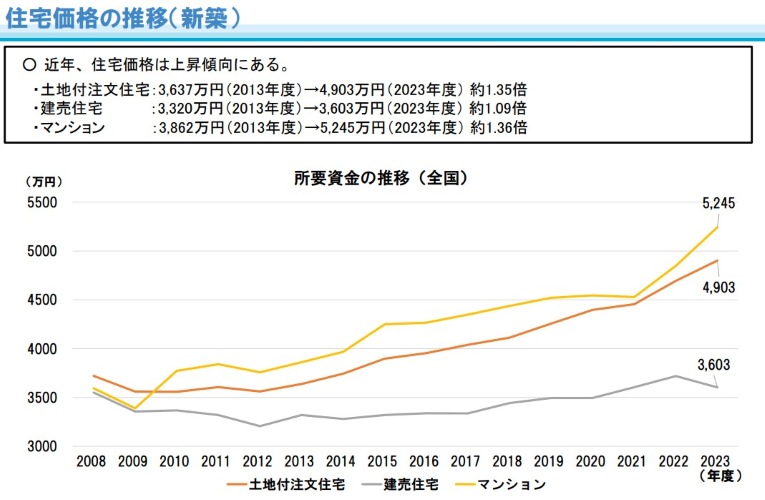 実際、国土交通省のデータでも、新築住宅価格はコロナ以降上昇し、その後も高止まり傾向が続いています